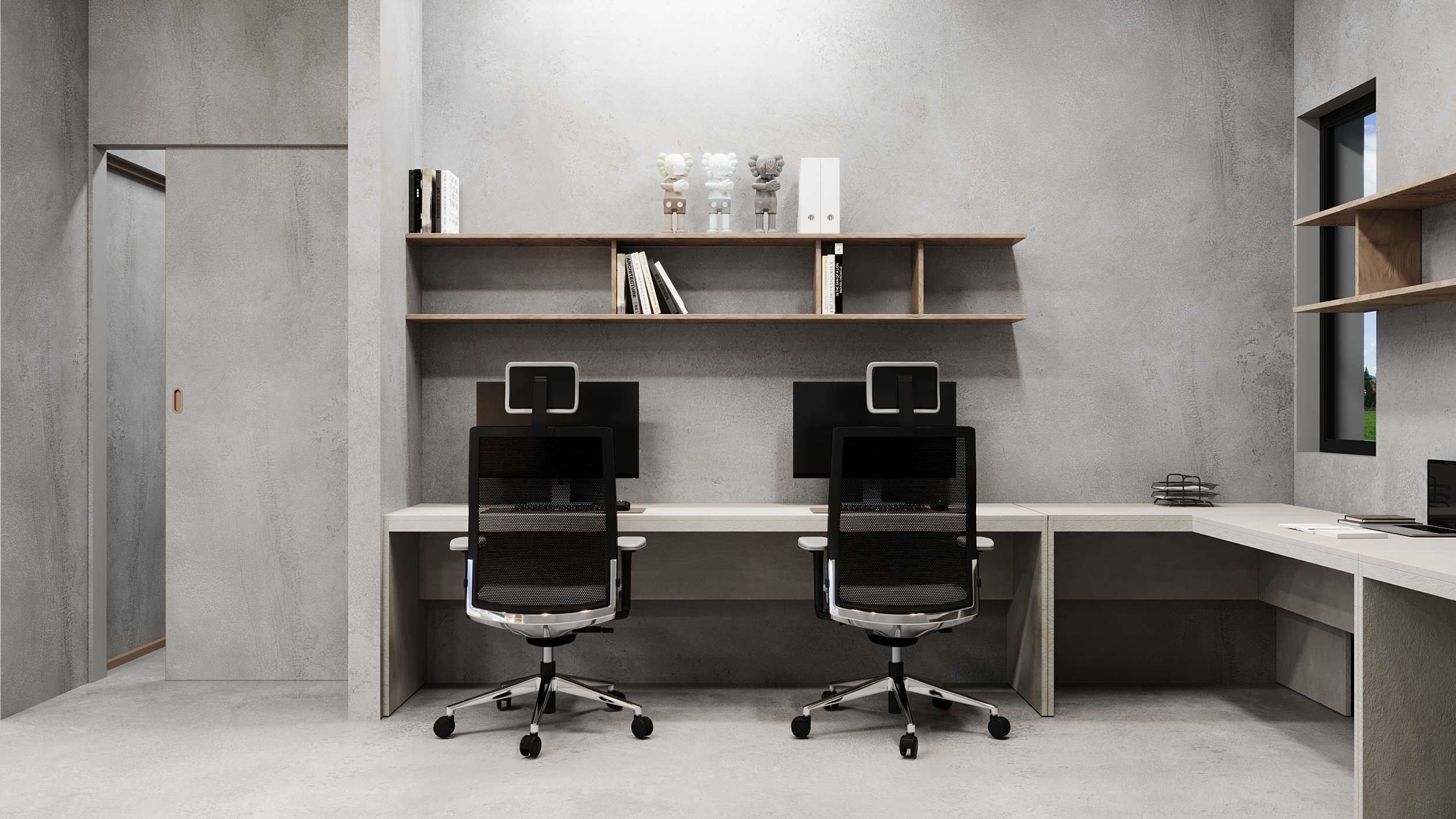 At the heart of the home, the dining area becomes a focal point where concrete walls meet the softness of natural wood. The custom-designed shelving unit, crafted with warm wooden tones and accentuated by subtle lighting, introduces depth and refinement to the space. The arched details within the shelving break the rigid linearity of concrete, creating an inviting and elegant atmosphere.
